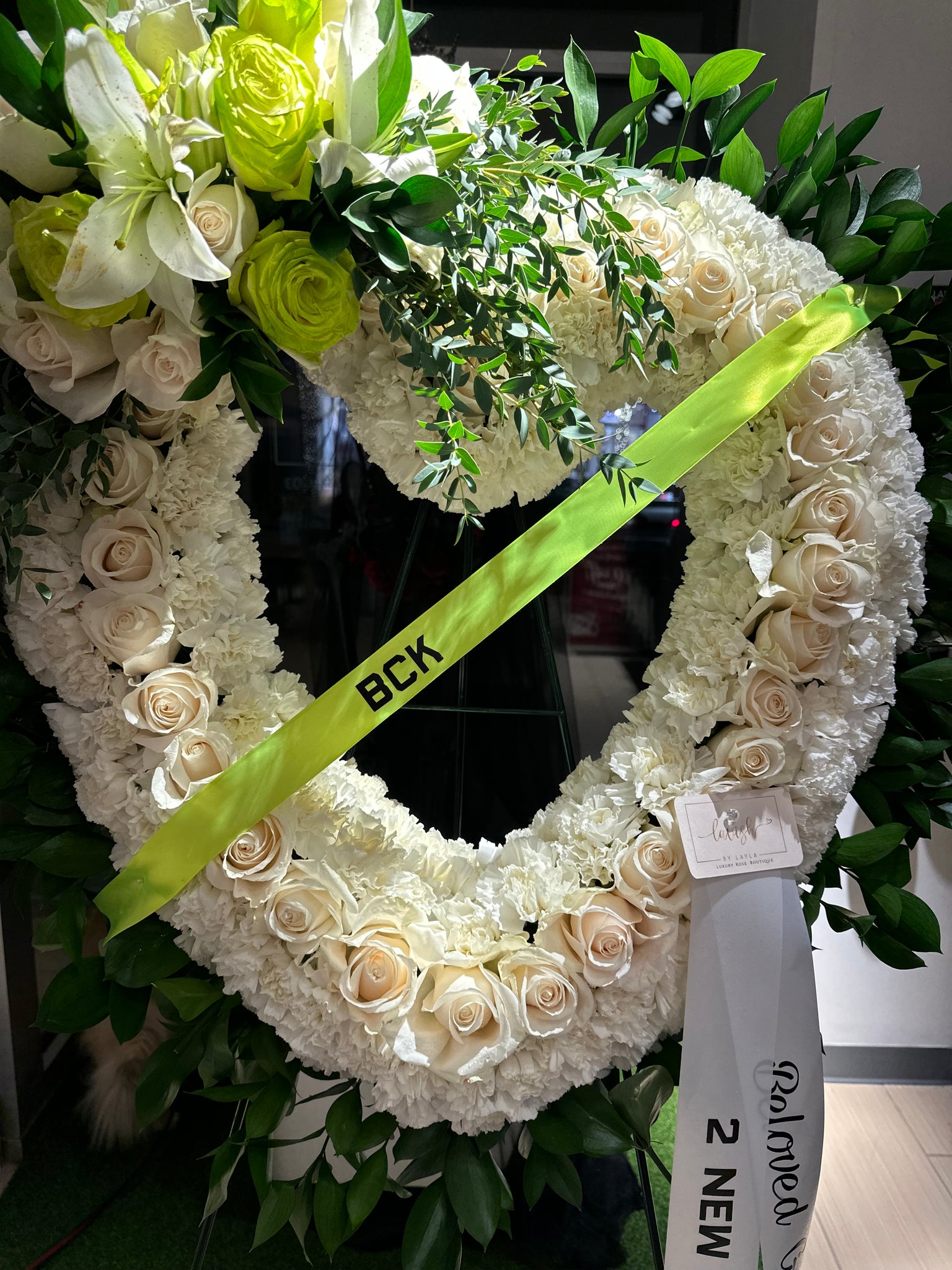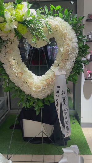 Open Heart Funeral arrangement with a mix of roses, carnations and poms. Custom color accent neon green was requested, color can be changed. Customized banners included.