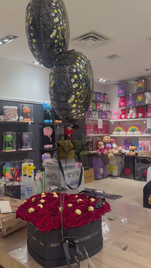 Heart with 75 Roses, Ferrero Rocher chocolate, and a bottle of Prosecco. This heart is different from the other in that it has 25 more roses and has more dimension. Bottle is pushed down so when it is removed, gap doesn’t look so evident.