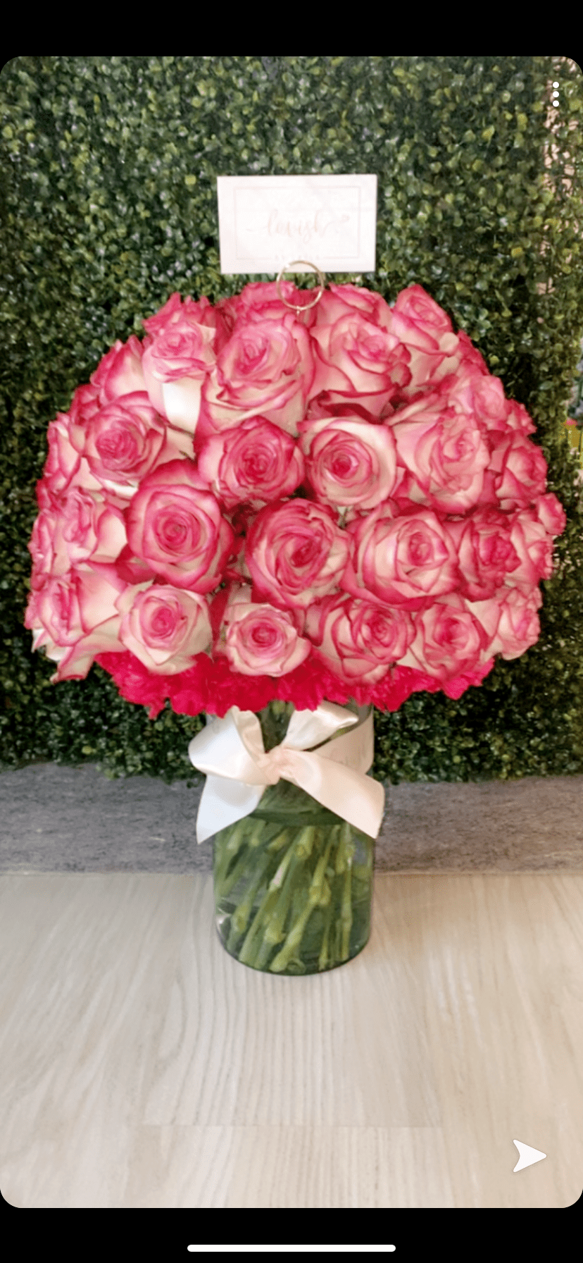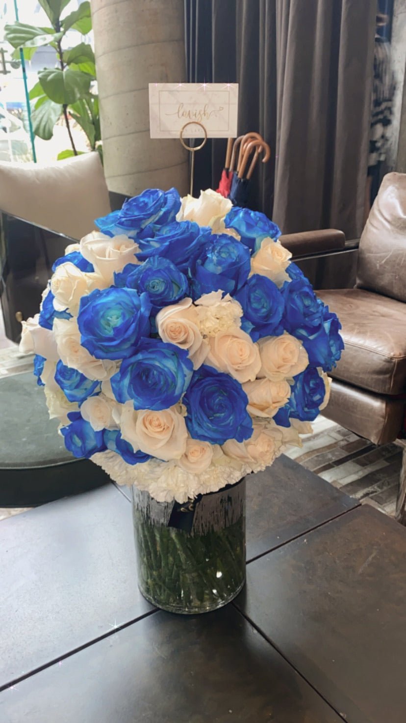 Each arrangement is a 1/1. Each uniquely has its own vase (type of vase) depends on my artistry. 100 Roses Grace the top of Chic vases to compose a Lavish arrangement.